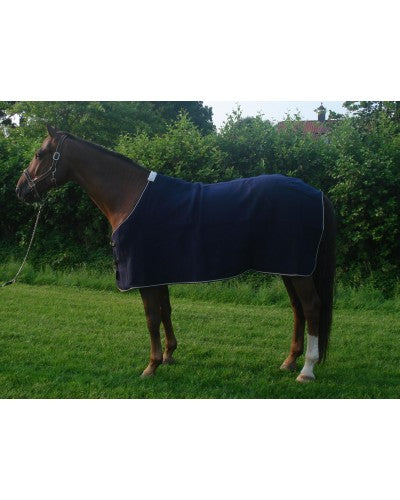 Blauwe Wollen statiedeken (1000gr) met 2 lederen dekensluitingen en messing gespen en blauw-beige afgebiesd.