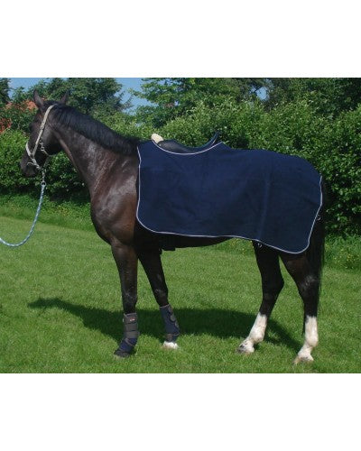Wollen uitrijdeken (1000gr) met zadeluitsparing en klittenband op de schoft. Blauw-grijs afgebiesd.
